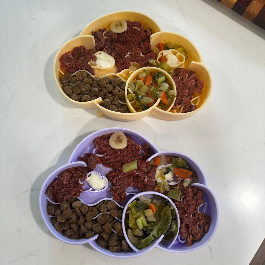 We love this bowl, it’s a favourite of ours. I love the different sections in different sizes to give the dogs a different challenge, super fun to plate up and because of the diversity in different sections, it really suits all sized dogs!