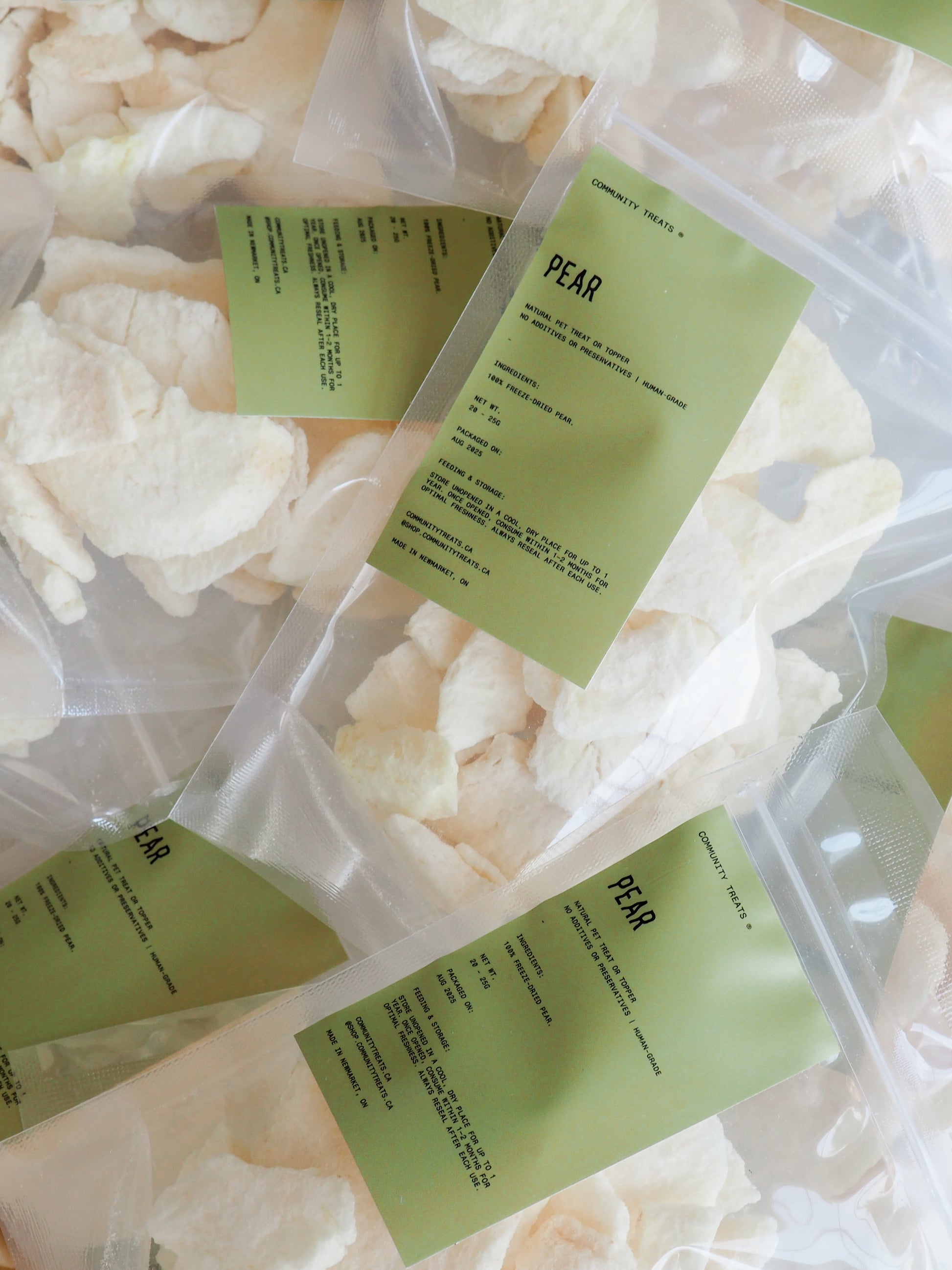 Our freeze-dried pears are crunchy, light, and melt-in-your-mouth with a hint of natural sweetness. We love pears because they’re a great source of fibre, vitamin C, and antioxidants for your dog. Human-grade and Canadian-made, which means it’s just as snackable for you as it is for your dog.