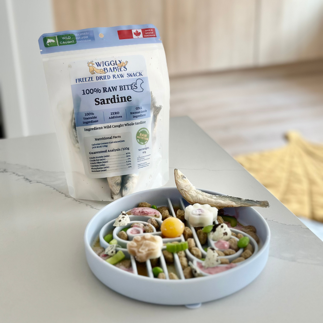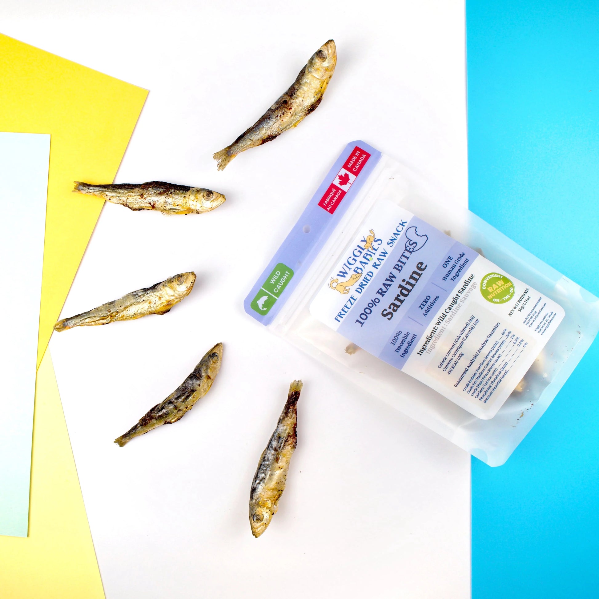 Wiggly Babies' sardines are sourced from a Canadian supplier with fisheries in the Mediterranean, ensuring larger, more savoury bites compared to typical sardines. These Mediterranean bites are perfect for pets that enjoy a crunchy, satisfying snack.
