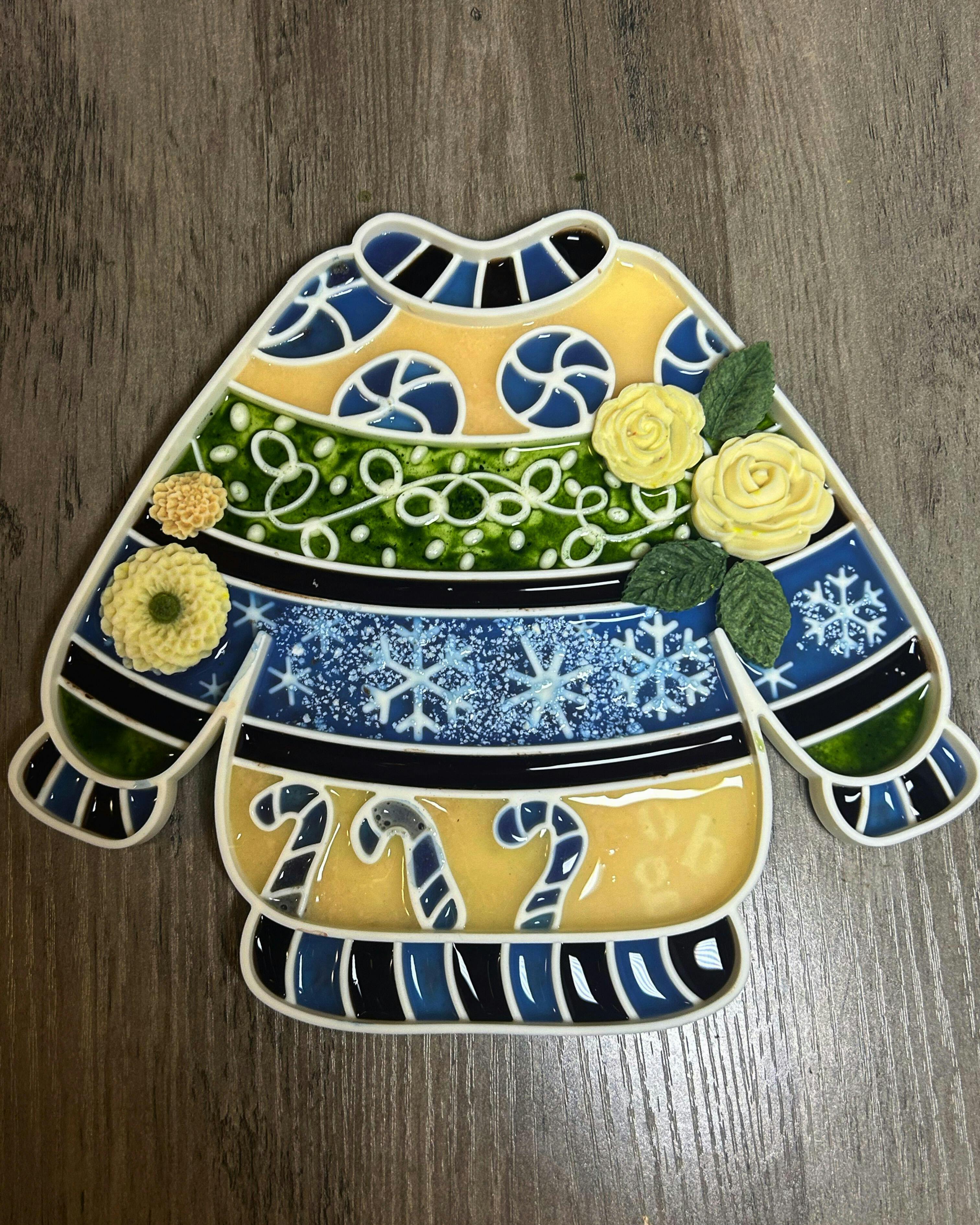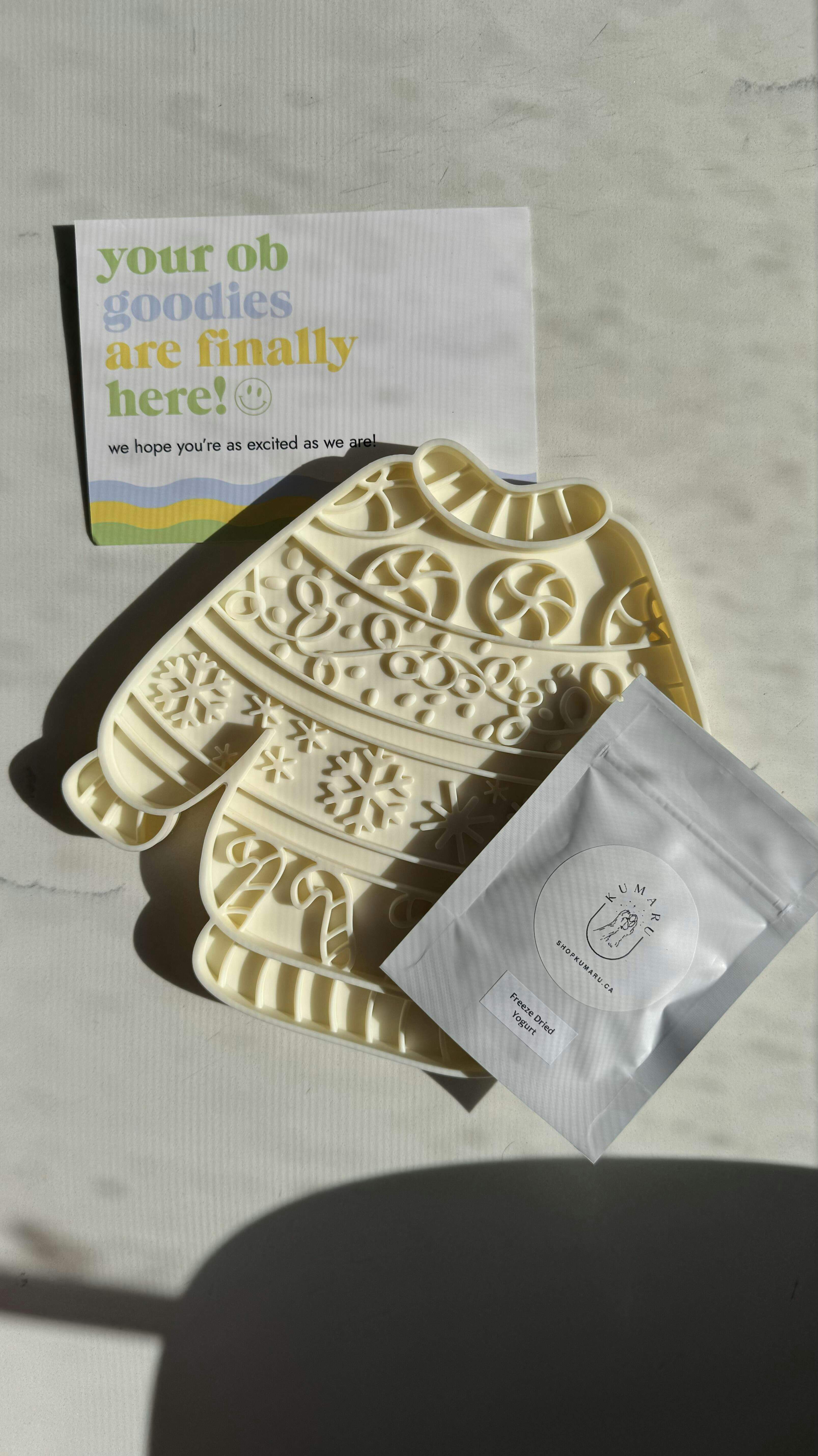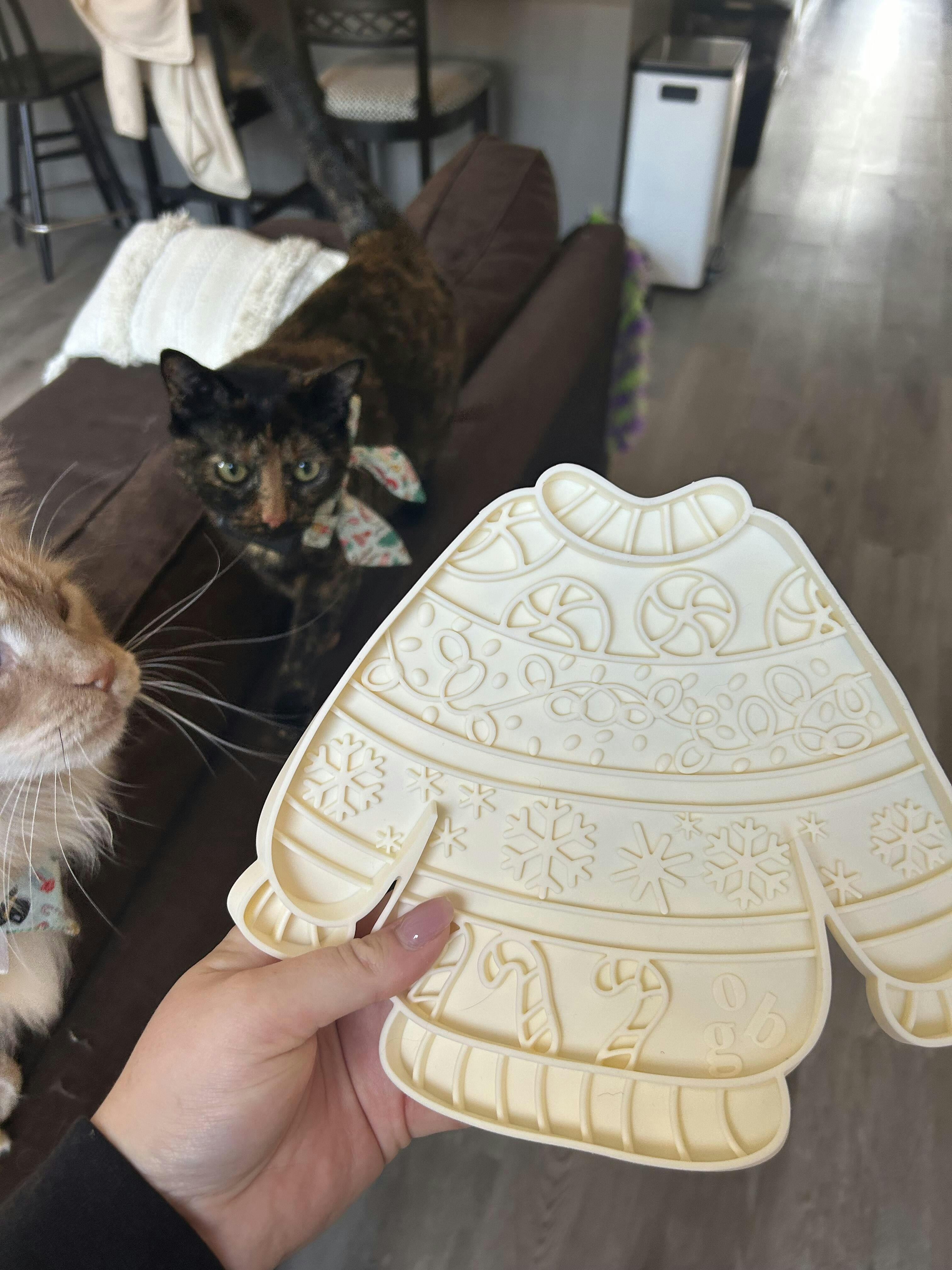 The ugly sweater lick mat measures 8.75 x 7.66 x 0.64 inches tall and has 70 suction cups below to ensure no travel during an enrichment sesh.