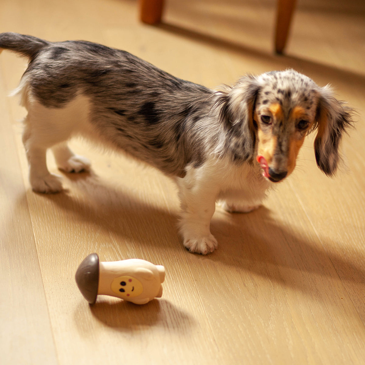 we're expanding ollie's fave squeaker toys with the veggie squad! meet monty mushroom - he might look a little risqué at times but who doesn’t love a good mushroom!