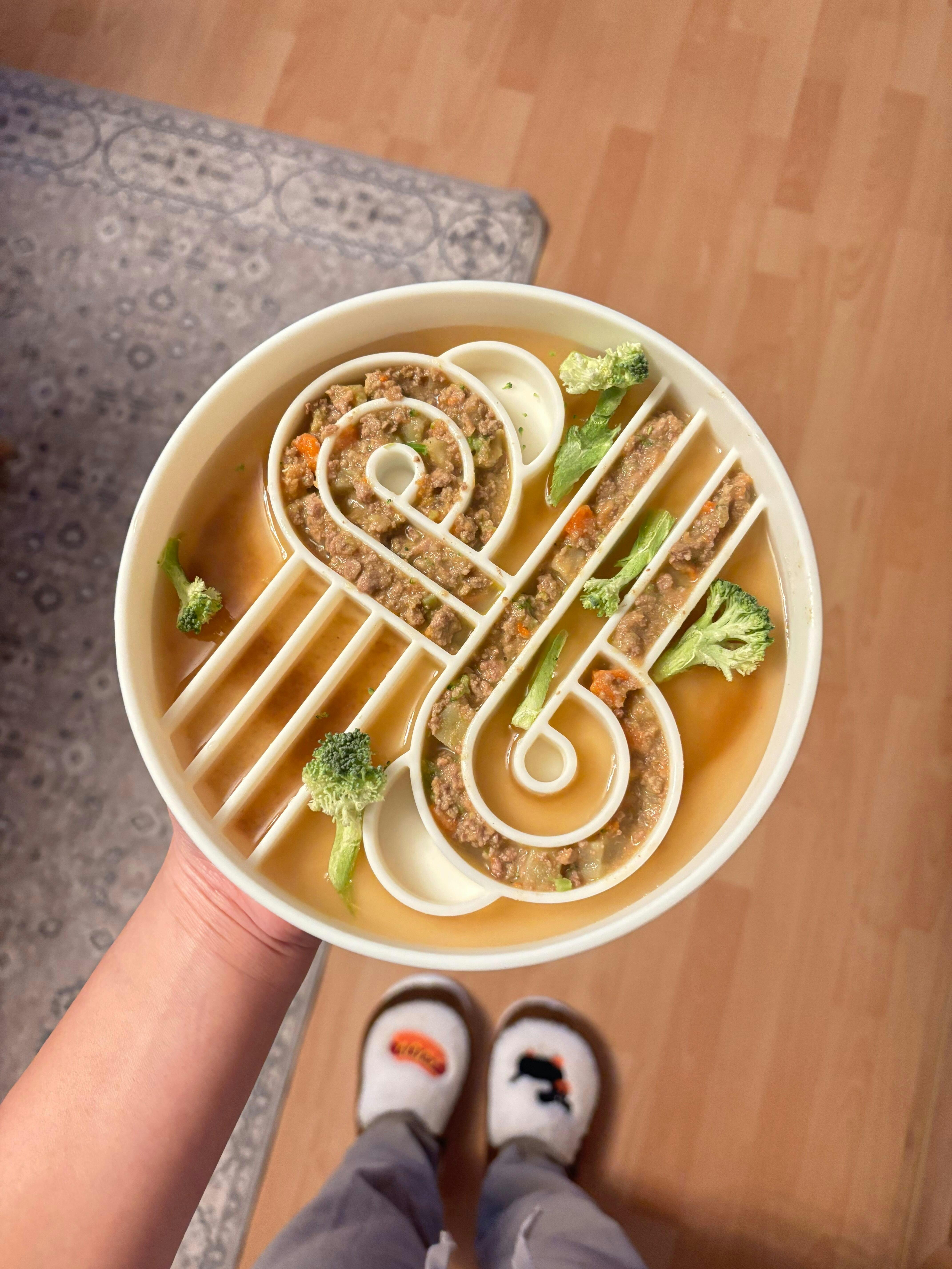 The Zoomies Slow Feeder was designed in-house, keeping all size breeds in mind. Named after it's fun race-track design!