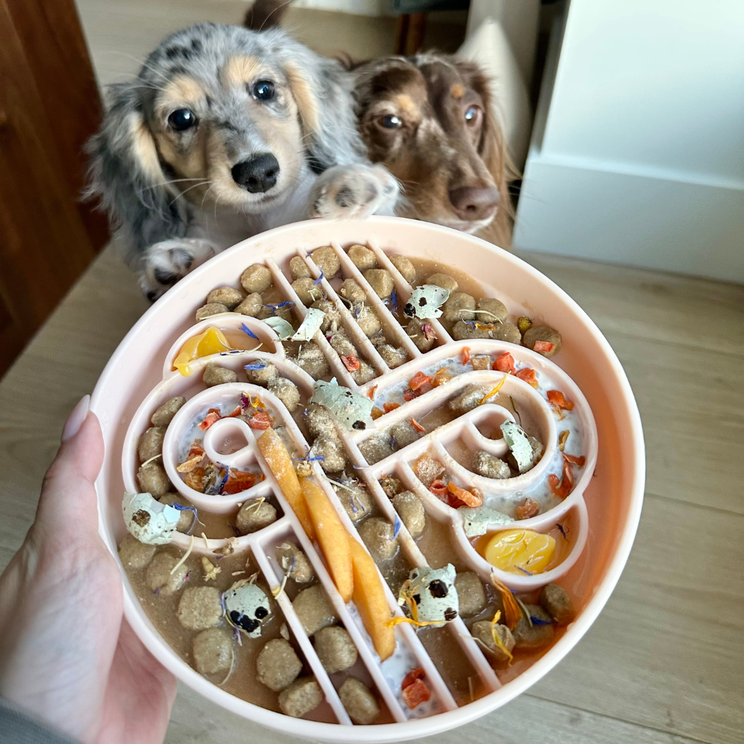 The Zoomies Slow Feeder was designed in-house, keeping all size breeds in mind. Named after it's fun race-track design!